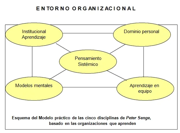 La quinta disciplina, de Peter Senge, concibe a la organización como un modelo práctico que contiene cinco disciplinas, que se describen a continuación: